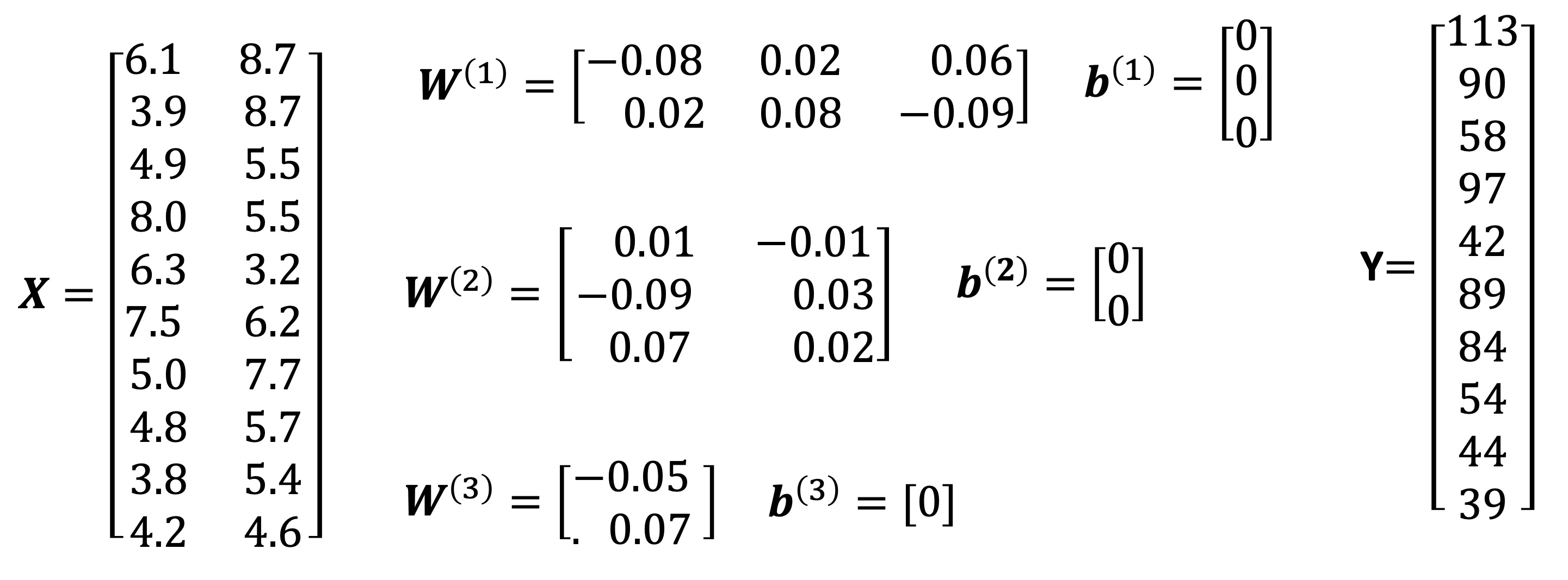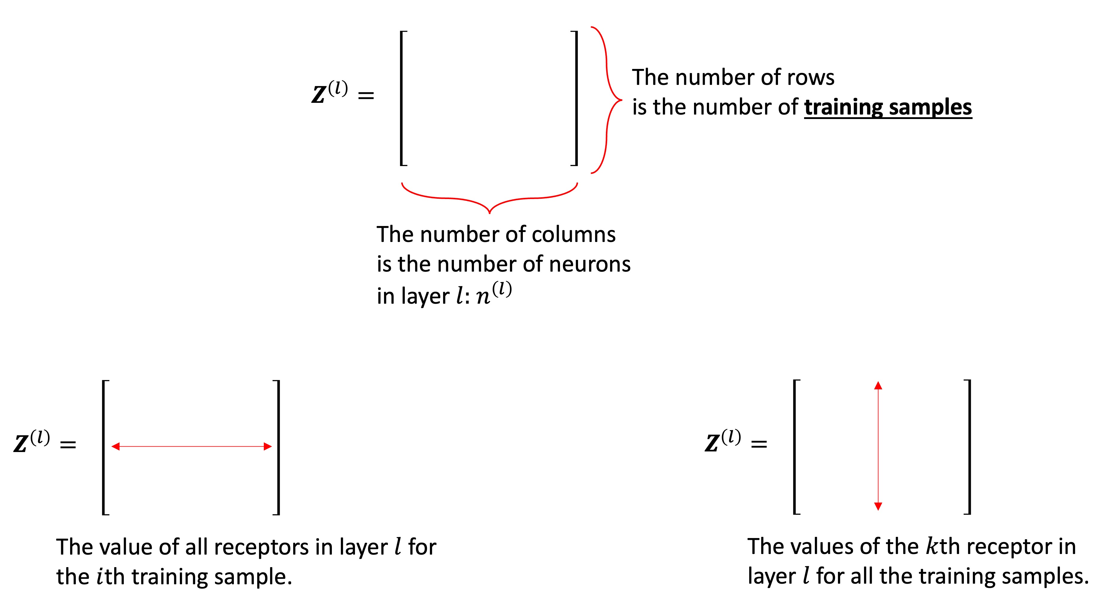 Remember: - \(\mathbf{Z}^{(l)} = \mathbf{X}^{(l-1)}\mathbf{W}^{(l)} + \mathbf{b}^{(l)}\) - \(\mathbf{X}^{(l)} = g^{(l)}(\mathbf{Z}^{(l)})\)