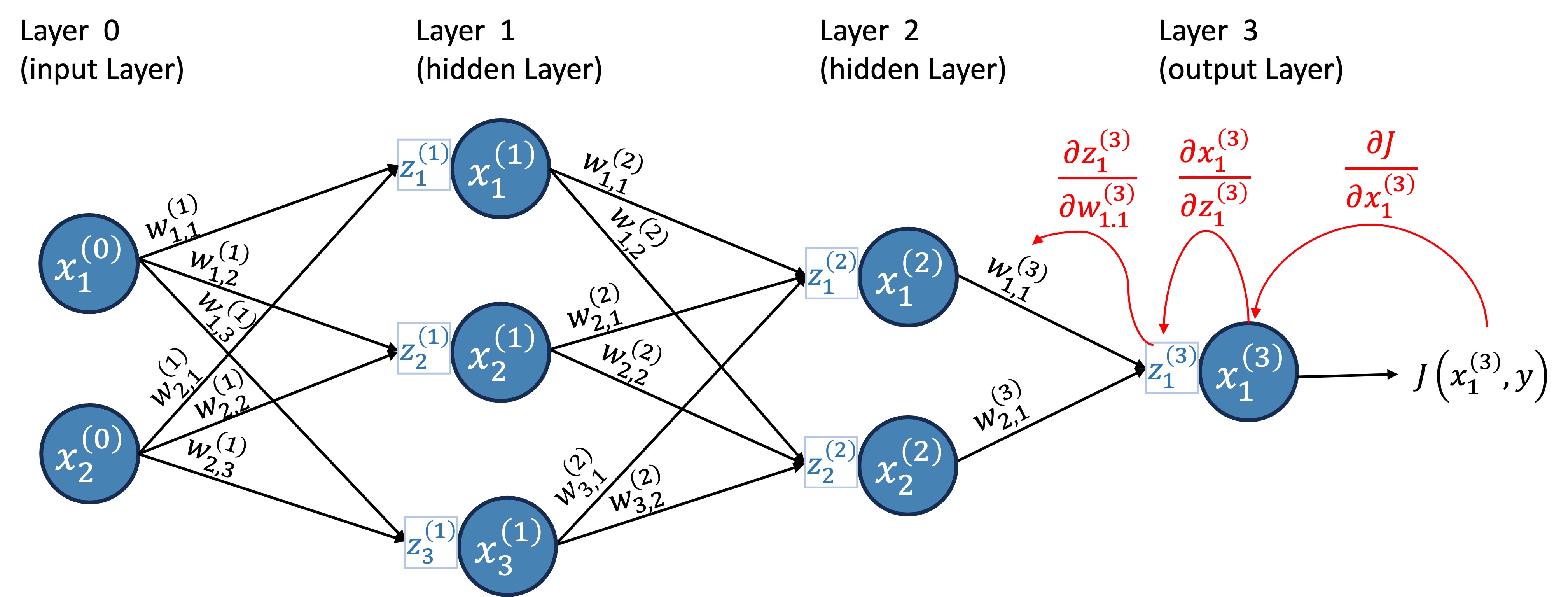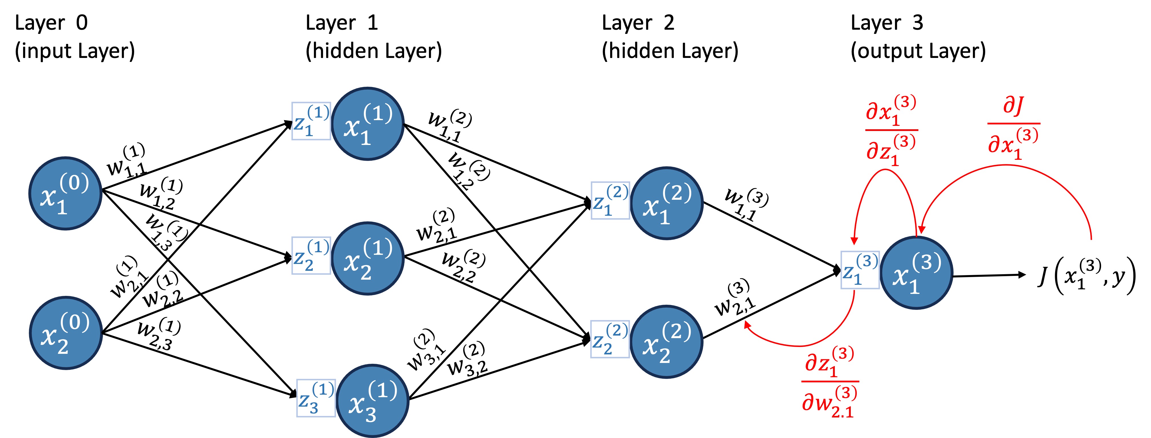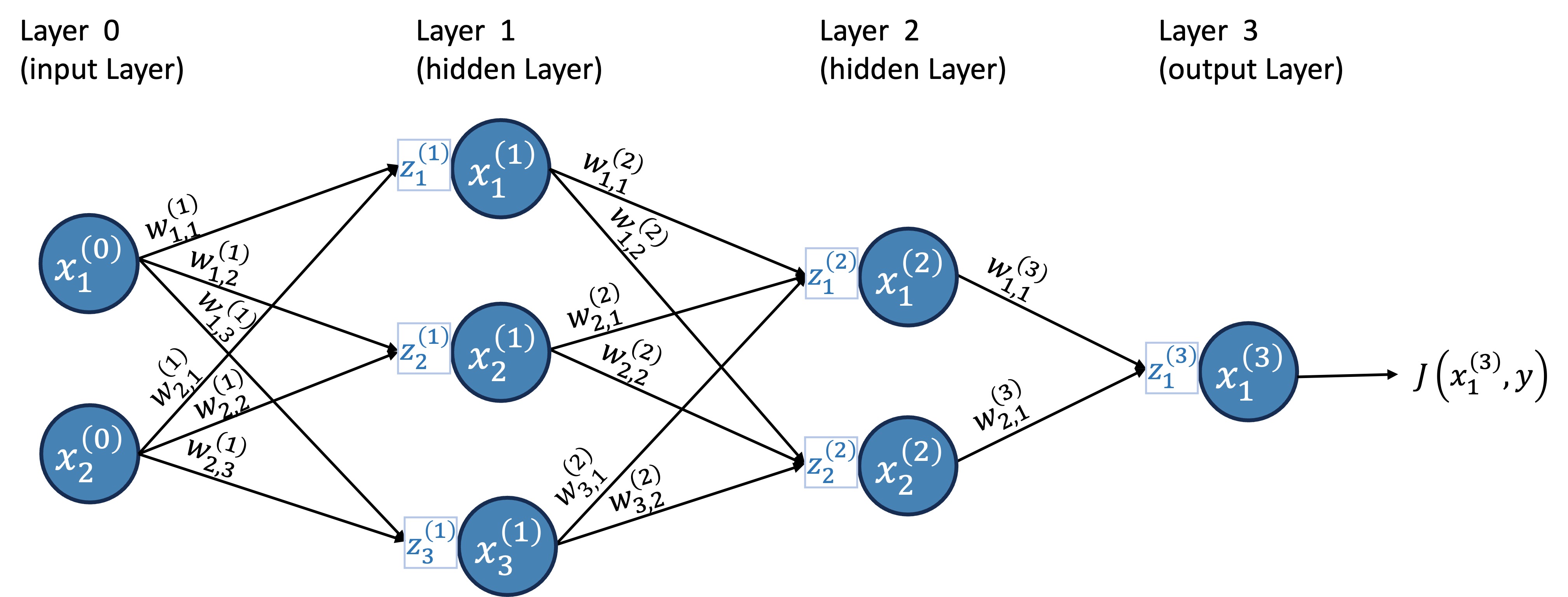 - Update the weights and biases using the computed gradients and a specified learning rate, as follows: \[ w_{ij}^{(l)} := w_{ij}^{(l)} - \eta \frac{\partial}{\partial w_{ij}^{(l)}}J(\mathbf{w}|\mathbf{X}, \mathbf{y}) \] \[ b_{j}^{(l)} := b_{j}^{(l)} - \eta \frac{\partial}{\partial b_{j}^{(l)}}J(\mathbf{w}|\mathbf{X}, \mathbf{y}) \] where \(\eta\) is the learning rate (say 0.001).