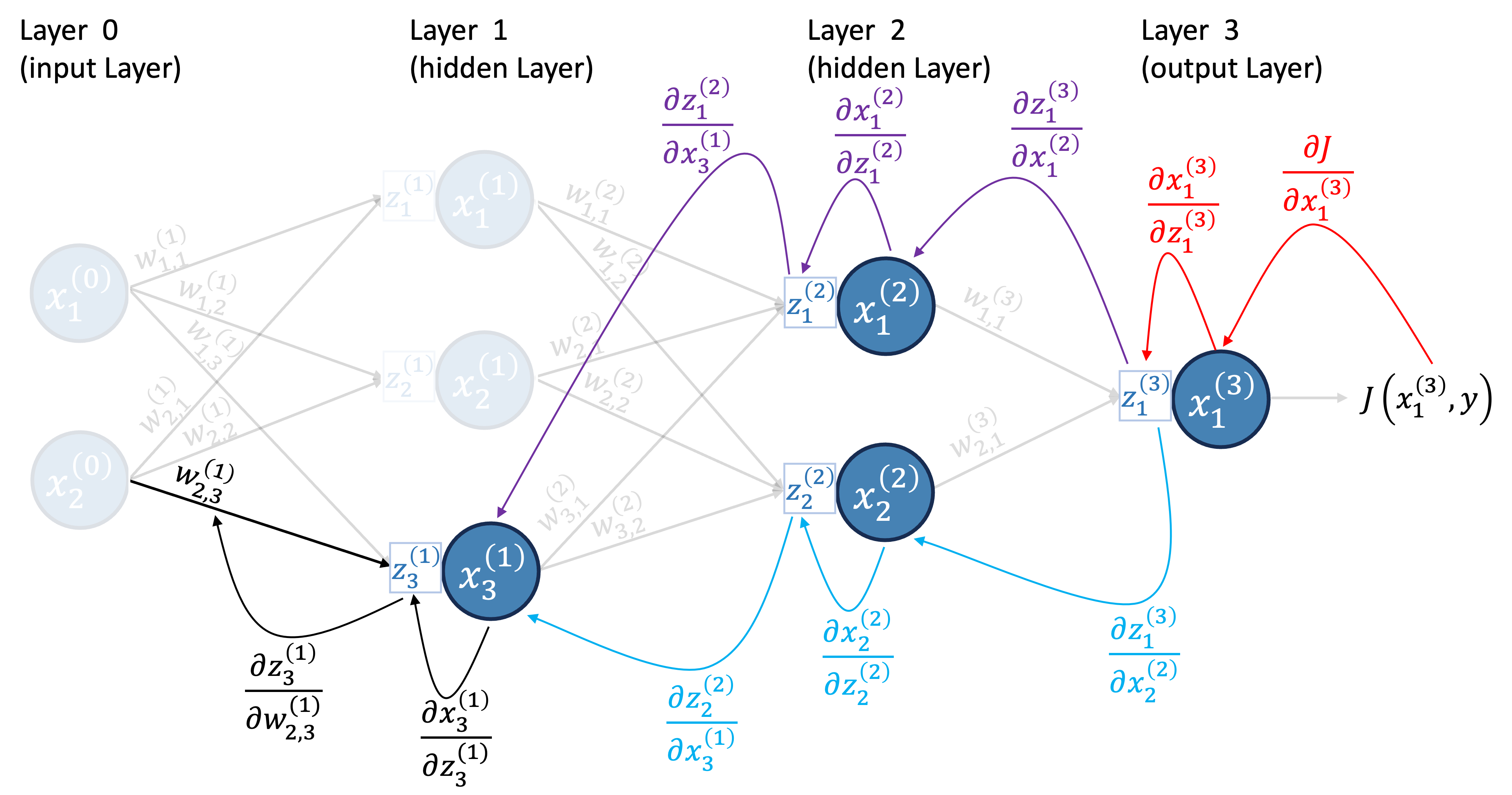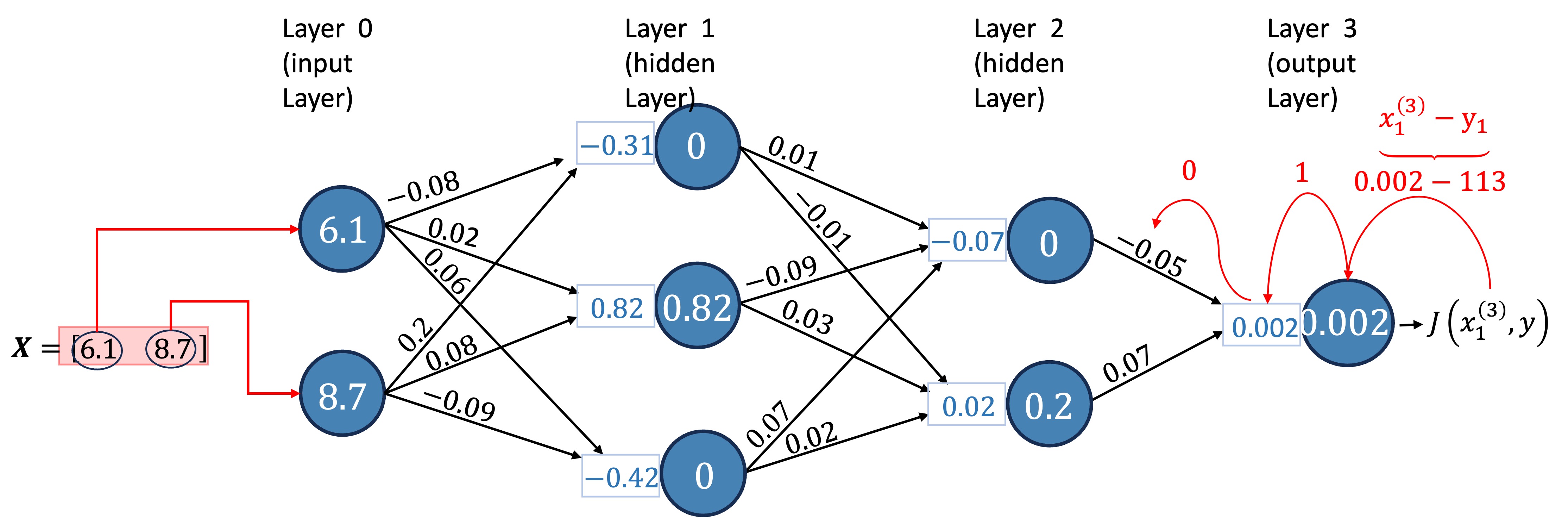 nn_test = NN([2, 2, 1], activation_relu_dict, activation_output_dict, {}, seed=1)5.3.3 Backward Pass